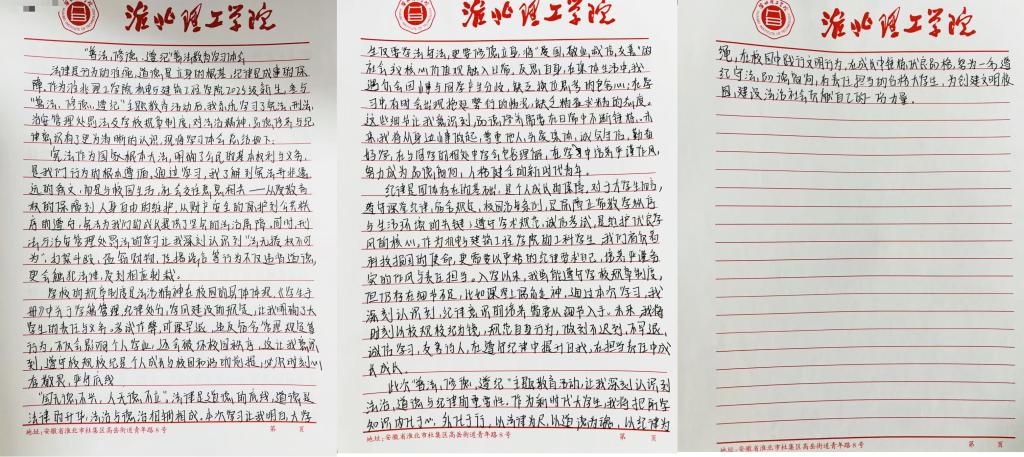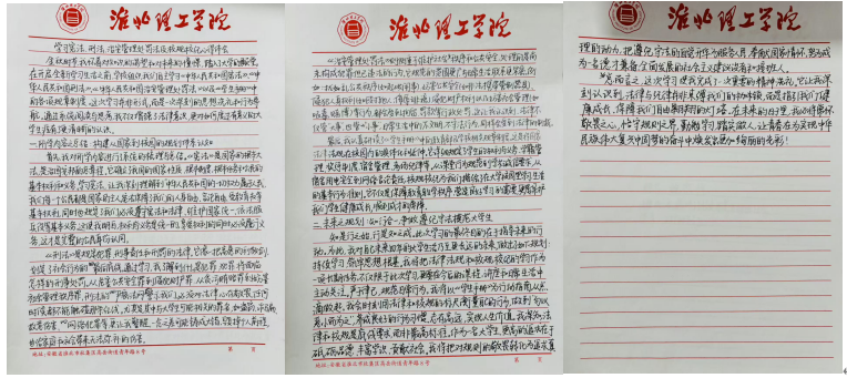 在自主学习阶段,同学们认真研读法律条文与校规校纪,结合自身成长经历和大学生活规划,梳理知识点、记录学习感悟。不少同学表示,此次自主学习让自己对法律的严肃性和校规的重要性有了更深刻的认识,也意识到法治素养是当代大学生不可或缺的基本素养。随后,同学们严格按照要求,撰写不少于1000字的手写学习体会,内容涵盖法律法规与校规校纪的学习总结、结合自身情况的深刻反思,以及未来遵法守纪、修身立德的具体规划。所有心得稿件均统一使用印有英国beat365官方网站标识的信纸书写,字迹工整、卷面整洁,充分展现了英国beat365官方网站新生的良好学风。