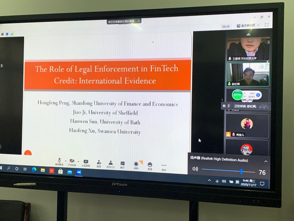 11月17日上午9点45分,欧博abg官网登录入口邀请山东财经大学金融学院院长、教授、博士生导师彭红枫做题为“The Role of Legal Enforcement in FinTech Credit: International Evidence”的线上学术报告。欧博abg官网登录入口部分教师和各专业研究生40余人参加了报告。本次报告由欧博abg官网登录入口院长王重润主持。